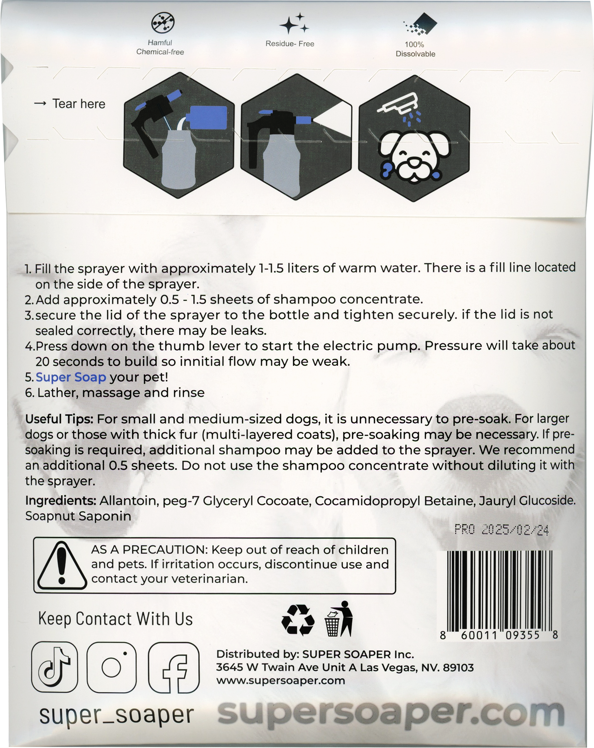 Simplify bath time with the Super Soaper Dog Bathing System—the eco-friendly, mess-free solution for effortless grooming. Our innovative shampoo sheets dissolve quickly inside our convenient electric pump sprayer, creating a luxurious, cleansing foam that's ready to spray directly onto your dog.
